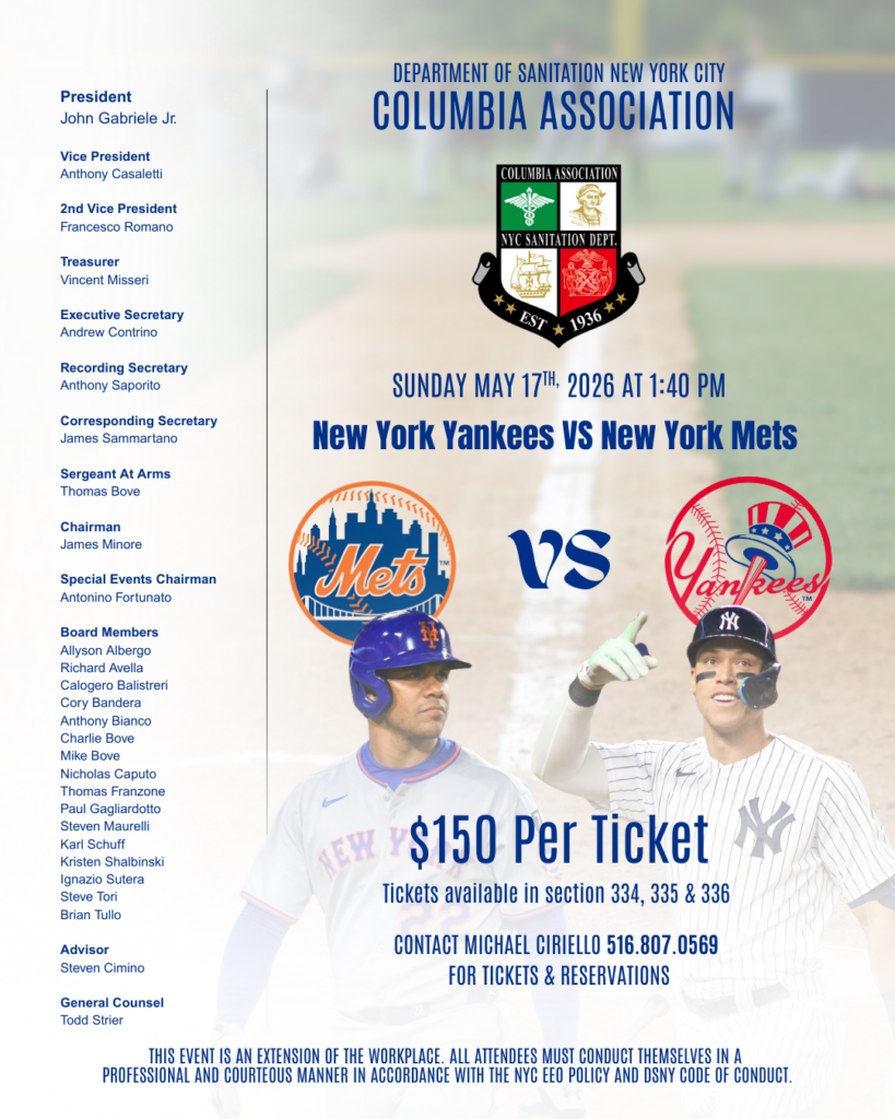 The DSNY Columbia Association is proud to partner with the New York Yankees to offer our members discounted tickets through our membership portal! A portion of proceeds from each ticket will directly benefit the charities we support. Catch a game and help out a good cause!